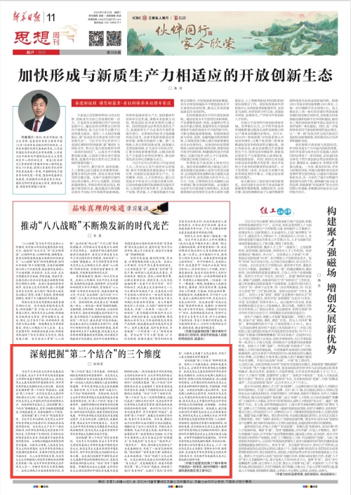 习近平总书记在文化传承发展座谈会上指出,在五千多年中华文明深厚基础上开辟和发展中国特色社会主义,把马克思主义基本原理同中国具体实际、同中华优秀传统文化相结合是必由之路。我们党在长期坚持“第一个结合”的基础上,又提出“第二个结合”,是对马克思主义指导作用机理认识上的一次新飞跃,极大深化了对马克思主义中国化时代化的规律性认识。站在新的历史起点上,深刻理解“第二个结合”的精髓要义,更有力地推进强国建设、实现民族复兴,需要把握好三个维度。