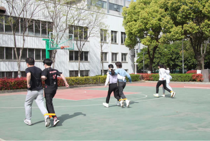第三项是有趣的“两人三足”比赛,参赛同学两两一组,在“一二一二”的口号下争相前进。本项活动考验两个人的默契程度,步调和步幅稍微不一致就很有可能“掉链子”。研究生处老师也摩拳擦掌,参与到了比赛当中,师生同乐、其乐融融。